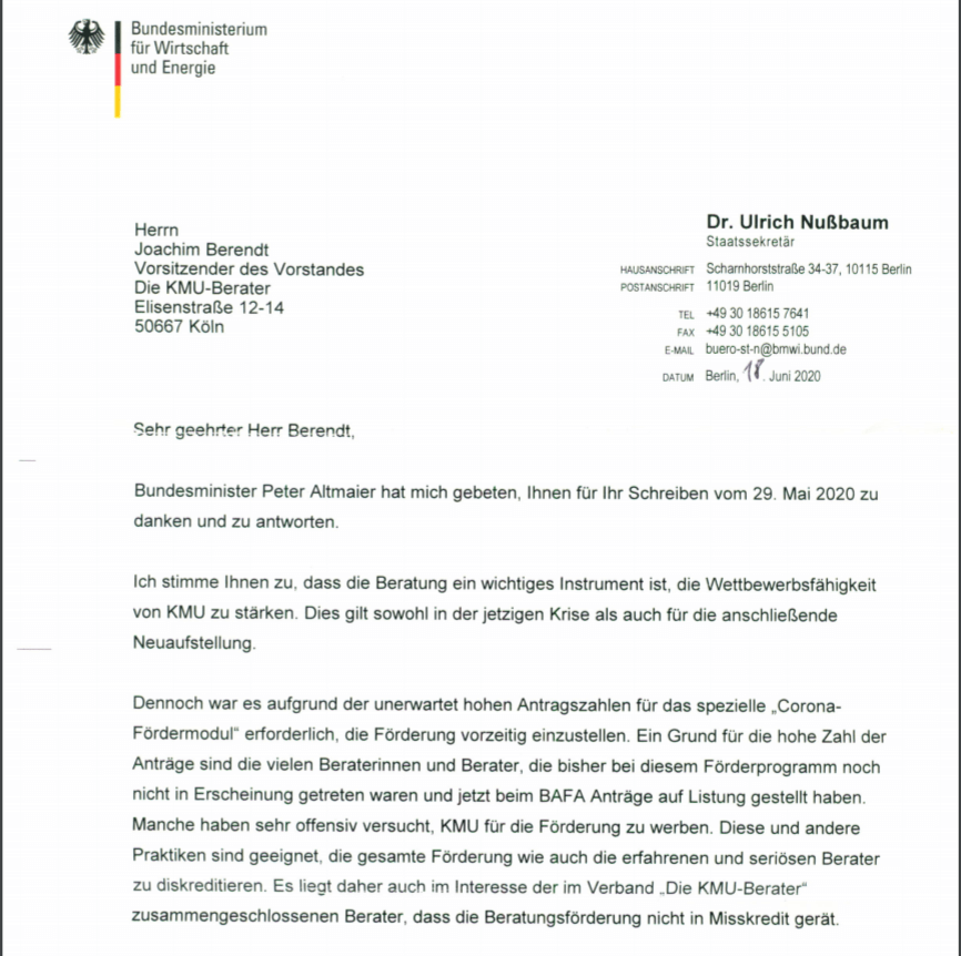 Staatssekretär Dr. Ulrich Nußbaum antwortet im Auftrag von Minister Altmaier auf den Offenen Brief des Bundesverbandes “Die KMU-Berater”, der vom Vorstandsvorsitzenden Joachim Berendt Ende Mai an Bundesminister Altmaier gerichtet worden war.