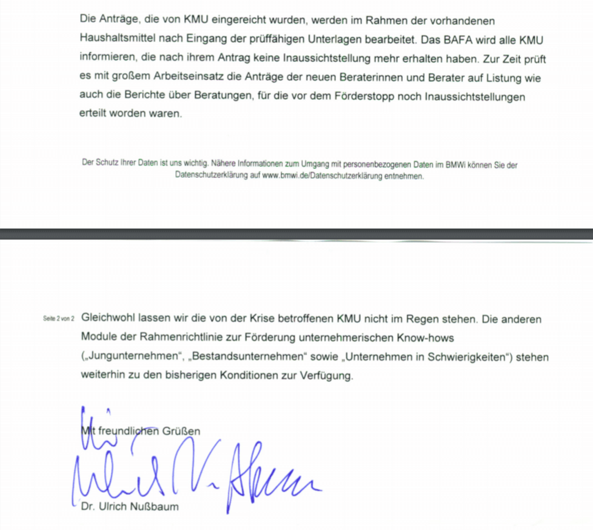 Antwortschreiben von Dr. Nußbaum zum Stopp der Corona-Beratungsförderung