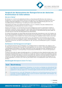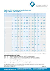 Die Übersicht stellt die Notensysteme von Sparkassen, Genossenschaftsbanken, Deutsche Bank, Commerzbank, Creditreform und Standard & Poors einander gegenüber. Ergänzend zeigt die Übersicht die mit den Noten jeweils verbundene Ausfallwahrscheinlichkeit für Unternehmen. Diese sagt aus, mit welcher Wahrscheinlichkeit Unternehmen mit dieser Ratingnote in einem Jahr insolvent sein werden. Auf Basis der Ausfallwahrscheinlichkeit können Unternehmen die Ratingnoten ihrer verschiedenen Banken vergleichen.