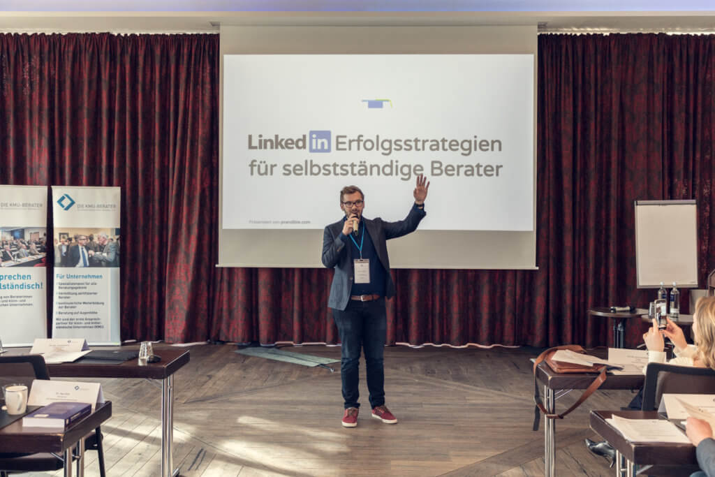In seiner Präsentation “LinkedIn Erfolgsstrategien für selbstständige Berater” stellte Paul Anderie von Prandible die Schrotflintenstrategie der Scharfschützenstrategie beim Netzwerken gegenüber. Er erläuterte den besonderen Nutzen von LinkedIn, hier mit dem Fokus auf KMU-Berater. Die Zuhörer erfuhren, worauf es inhaltlich bei der Erstellung eines LinkedIn-Profils ankommt. Auch was die vielen versteckten Features der LinkedIn-Profiloberfläche betraf, brachte Paul Anderie Licht ins Dunkel. So bot sich den Teilnehmern ein umfassendes Bild, wie LinkedIn professionell verwendet werden und einen nachhaltigen Nutzen für das eigene Business erzeugen kann.