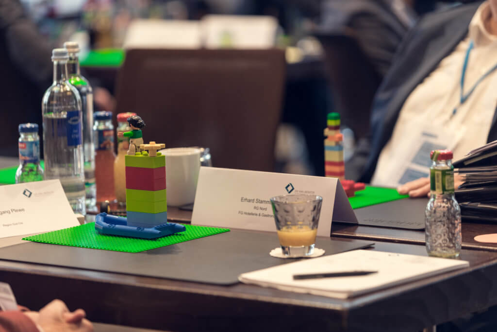 Die Keynote des Speakers Steffen Powoden “Kreative Denkmodelle – Abstraktes wird greifbar” folgte nach der Kaffeepause. Beim Betreten des Saales bot sich den Zuhörern ein ungewöhnliches Bild des Tagungsraumes: Statt der Tischreihen erwarteten sie mehrere Tischgruppen und verschiedene Boxen, die Legosteine und -figuren in allen Farben und Formen bereithielten. Es folgte ein spannender Vortrag zum Thema Lego Serious Play (LSP), an dessen Ende die Zuhörer in den Genuss einer Live-Anwendung kamen. So wurde die Methode auf spielerische Weise erfahrbar und animierte verschiedene Teilnehmer/innen, LSP im Berateralltag zu integrieren.
